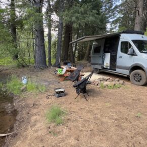 Back at Lake Margaret, we enjoyed dinner by the brook, warmed by the propane fire pit, and texted the kids via Starlink. The connection was miraculously good, despite a tiny hole in the trees. Last month my good friend Jake sold me a spectacular travel guitar that I have always envied. It is a Blackbird Rider carbon fiber travel guitar and it has inspired me to practice again. I will never camp without it again.